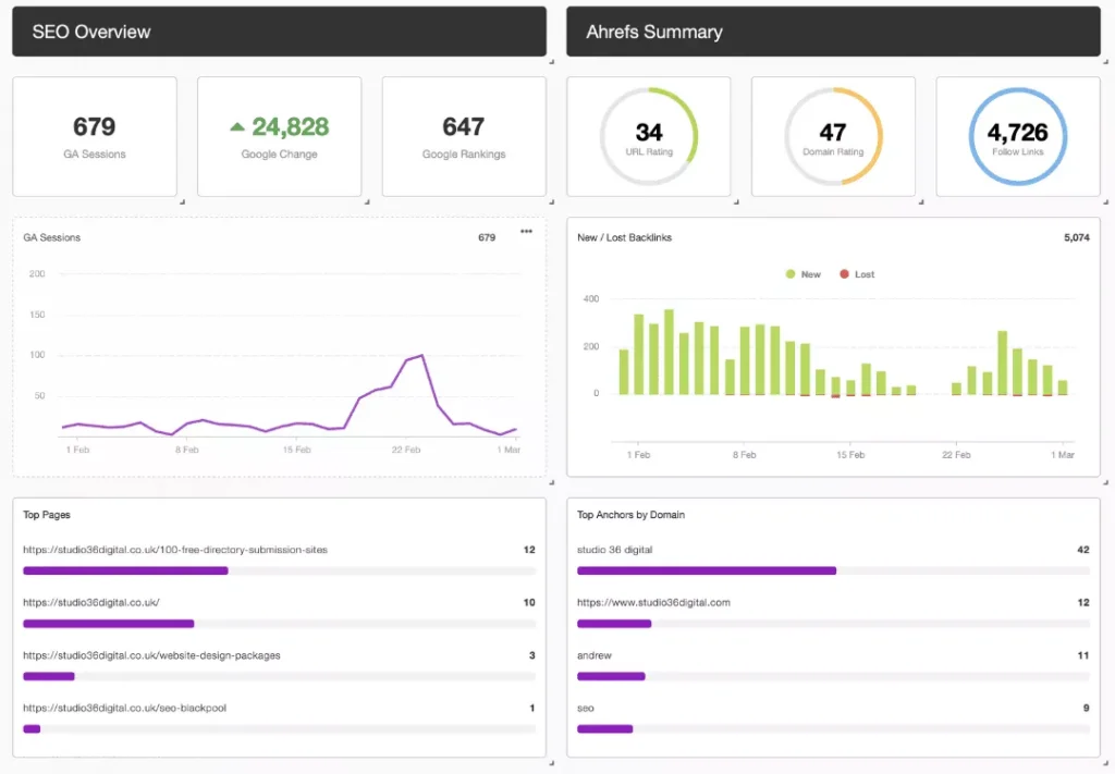 At Studio 36 Digital we believe in being fully transparent. Which is why we provide a comprehensive Monthly SEO Report for each of our valued clients, whichever of our affordable SEO Packages you choose. You’ll find detailed insights into your website traffic volume, traffic sources, ranking positions and new backlinks pointing to your website.